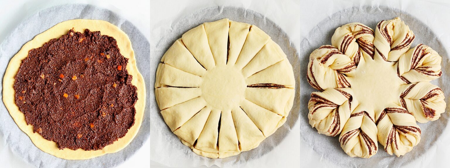 - Zrobić 16 nacięć nie docinając do środka – ja kładę na środku placka miseczkę o średnicy 9 cm, górą do dołu. Następnie brać w dłonie dwa sąsiadujące ze sobą kawałki ciasta i każdy obkręcić dwukrotnie ku sobie, na koniec zlepiając końce obu kawałków razem. Postąpić tak ze wszystkimi pozostałymi kawałkami. Przykryć kuchenną ściereczka i odstawić do wyrośnięcia na 30 minut. Posmarować gwiazdę roztrzepanym jajkiem. Piec w temperaturze 175 stopni przez około 30 minut (do zarumienienia). Wyciągnąć odstawić.